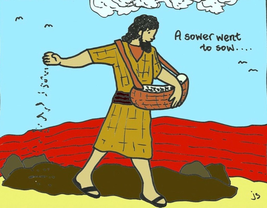 “That same day Jesus went out of the house and sat beside the sea. Such great crowds gathered around him that he got into a boat and sat there, while the whole crowd stood on the beach. And he told them many things in parables, saying: ‘Listen! A sower went out to sow. And as he sowed, some seeds fell on the path, and the birds came and ate them up. Other seeds fell on rocky ground, where they did not have much soil, and they sprang up quickly, since they had no depth of soil. But when the sun rose, they were scorched; and since they had no root, they withered away. Other seeds fell among thorns, and the thorns grew up and choked them. Other seeds fell on good soil and brought forth grain, some a hundredfold, some sixty, some thirty. Let anyone with ears listen! …Hear then the parable of the sower. When anyone hears the word of the kingdom and does not understand it, the evil one comes and snatches away what is sown in the heart; this is what was sown on the path. As for what was sown on rocky ground, this is the one who hears the word and immediately receives it with joy; yet such a person has no root, but endures only for a while, and when trouble or persecution arises on account of the word, that person immediately falls away. As for what was sown among thorns, this is the one who hears the word, but the cares of the world and the lure of wealth choke the word, and it yields nothing. But as for what was sown on good soil, this is the one who hears the word and understands it, who indeed bears fruit and yields, in one case a hundredfold, in another sixty, and in another thirty.’”