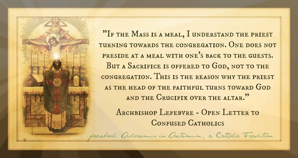 Since the 1970s, Catholics have been led to believe by a false presentation of Vatican II that the Mass is primarily a symbolic, communal, fellowship meal and a reenactment of the Last Supper. The truth is the Sacred Liturgy is chiefly a sacrificial worship where the priest is offering the Father the very best we have, the only sacrifice that could possibly please Him – His perfect Son, the spotless Lamb of God. When the priest speaks the words of Consecration at Mass, he is not addressing the congregation – he is directing them to God. The priest is speaking in the person of Christ and indicating that this act of our worship, as members of the Body of Christ, is united to the perfect sacrifice of Jesus on the cross. Thus, the priest must face both the tabernacle and the altar of the sacrifice, and since the Son has generously made us members of His body, this is our offering as well, and therefore we must stand behind the priest facing in the same direction he is.