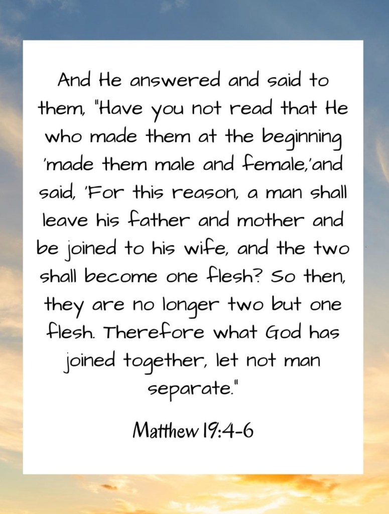 “What therefore God has joined together, let not man put asunder…And I say to you: whoever divorces his wife, except for unchastity, and marries another, commits adultery.” (Mt 19:6,9)