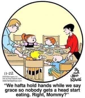 Some families reading this will be overwhelmed with the above suggestions because they cannot envision taking time to say a comprehensive grace together when their family rarely even eats at the same table. It is understood that the modern family with elementary-age and high school-age kids is more often than not going their separate ways most evenings, such as with dad not yet home from working out at the gym, with mom on the road picking up the younger daughter after gymnastics practice, and with the older son hanging out at a friend’s house after football practice. In this situation of a family who finds themselves rarely all at home during the dinner-hour, a suggestion is they sit down as a family every Sunday night to calendar the upcoming week’s family schedule and firmly resolve there will be at a set number of specific nights of the week when everyone will be required to be home to eat dinner together as a family. It may only be three nights a week to start, but that 43% success rate can eventually lead to increasing numbers as the family finds the together-time beneficial to their spiritual and physical health and ultimately makes family dinners a top priority.