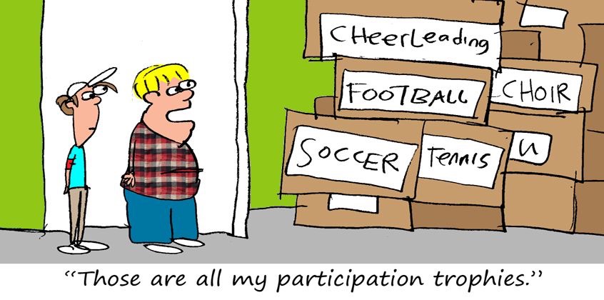 Realizing that certain children may need praise to raise low self-esteems, and receiving tangible awards for effort/participation actually in these cases could prove beneficial, parents still need to make sure they don’t reward their sons and daughters too often with undeserved trophies, ribbons, and certificates. By the time they’re 10-years-old, some kids nowadays already have 10 trophies collecting dust on their bedroom dressers – from the one that simply announces, “Kindergarten Soccer” to the one with the plaque reading, “2nd Grade T-Ball Participant.”